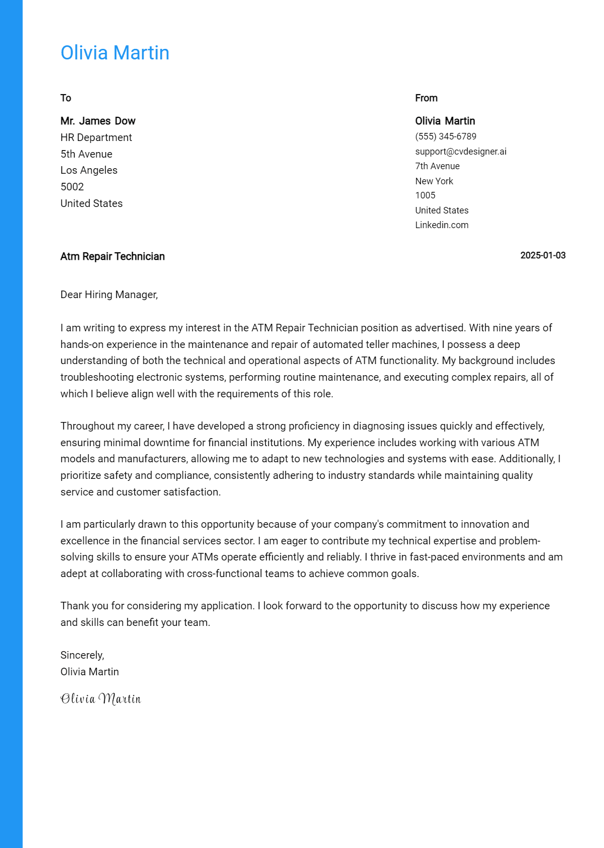 Highlight Your Technical Skills: Begin your cover letter by emphasizing your technical expertise relevant to ATM repair. Mention specific skills such as electrical troubleshooting, hardware repair, and familiarity with various ATM models. Use relevant keywords to catch the hiring manager's attention and make sure to relate them to the job description.