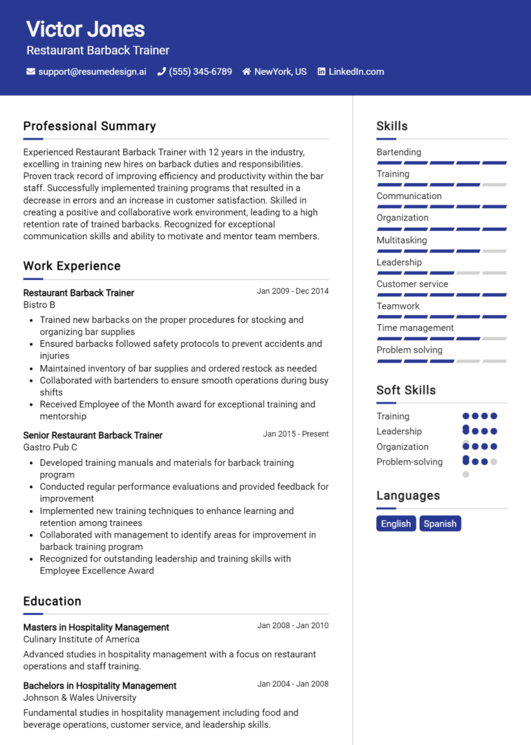 11 Restaurant Barback Trainer Resume Examples And Templates for 2025