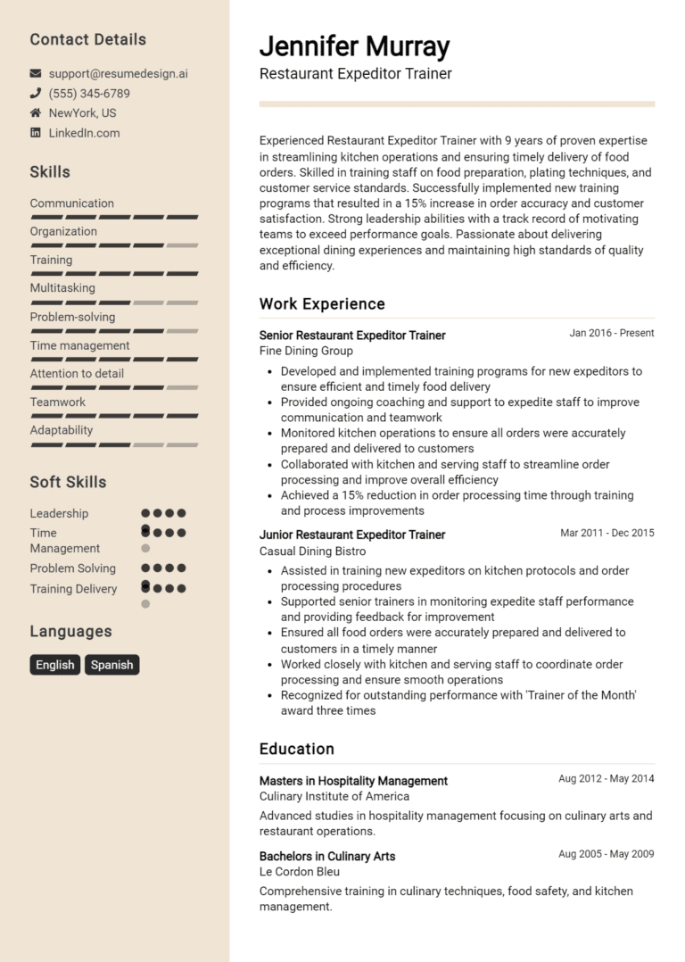 11 Restaurant Expeditor Trainer Resume Examples And Templates for 2025 (Downloadable)