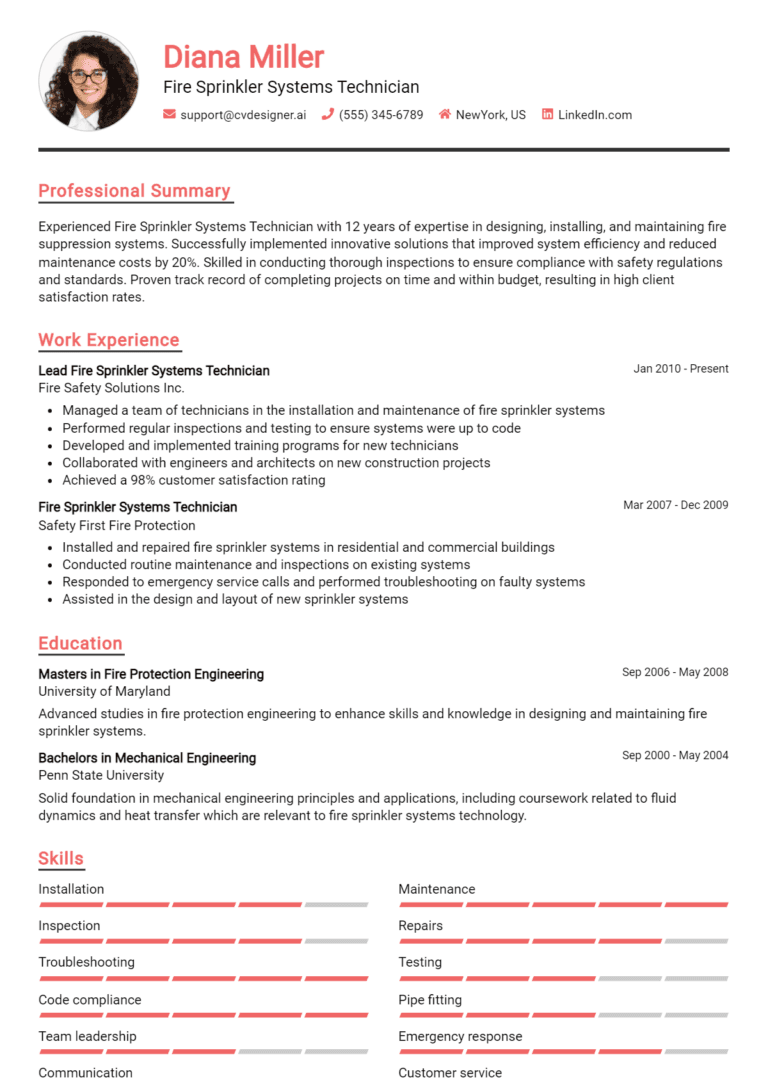 17 Fire Sprinkler Systems Technician Resume Examples And Templates for 2025: Top Tips