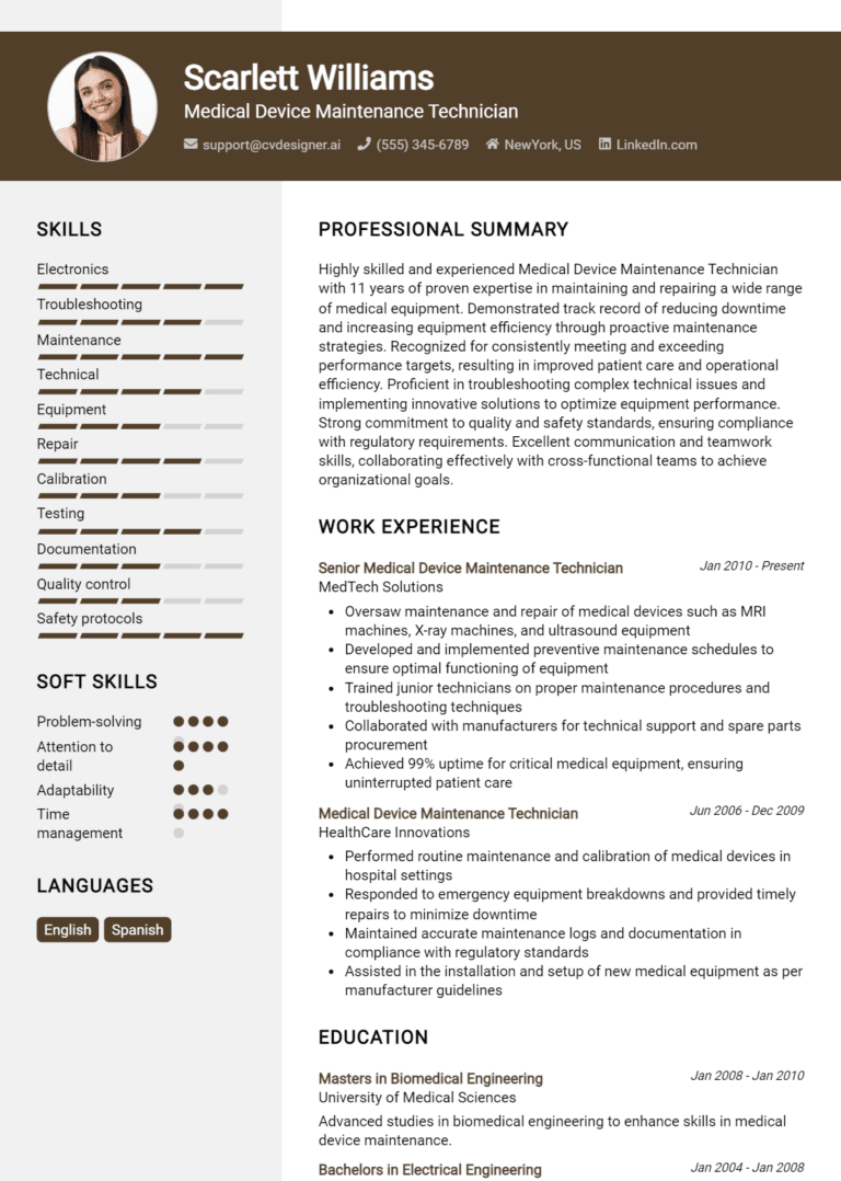 17 Medical Device Maintenance Technician Resume Examples And Templates for 2025